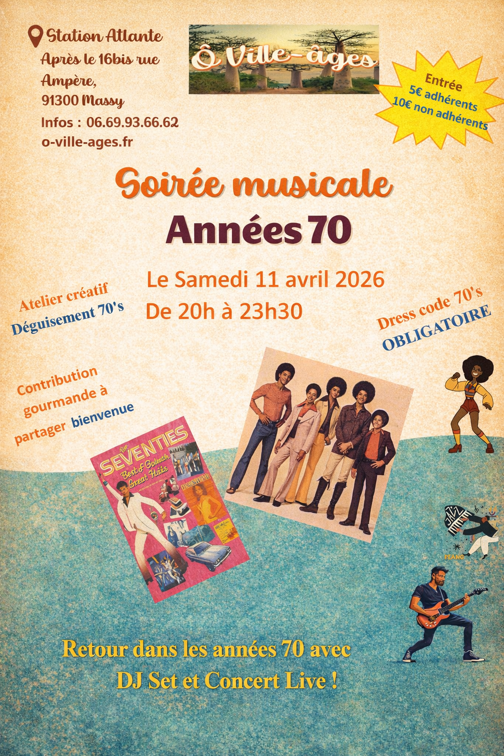 Ô Ville-Âges vous convie à une soirée musicale "Années 70" le samedi 11 avril de 20h à 23h30.Plongez dans l’ambiance mythique des années 70 ! 🪩